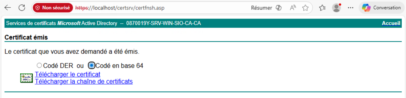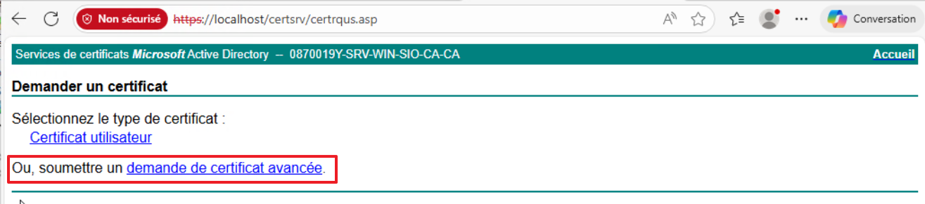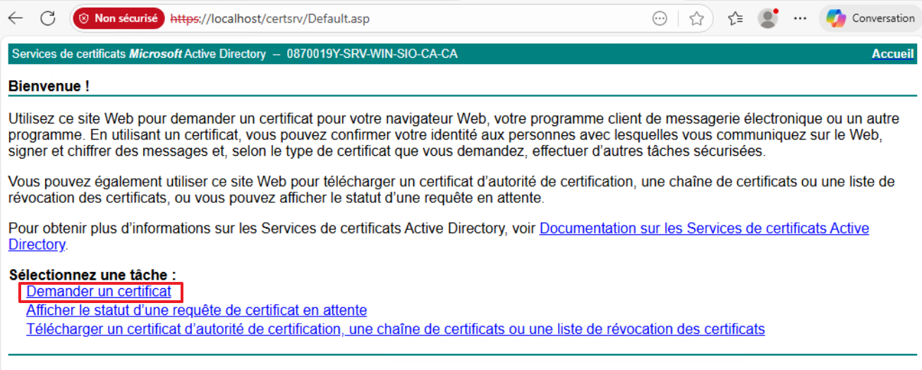 - Depuis un PC Windows membre du domaine, accédez à http://ADCS_SERVER/certsrv