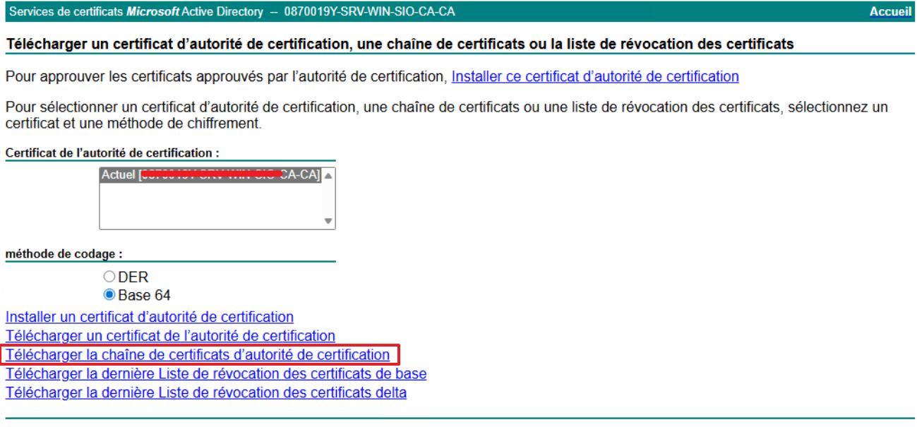 - cliquez sur Télécharger la chaîne de certificats d'autorité de certification au format Base 64 pour obtenir le fichier certnew.p7b :