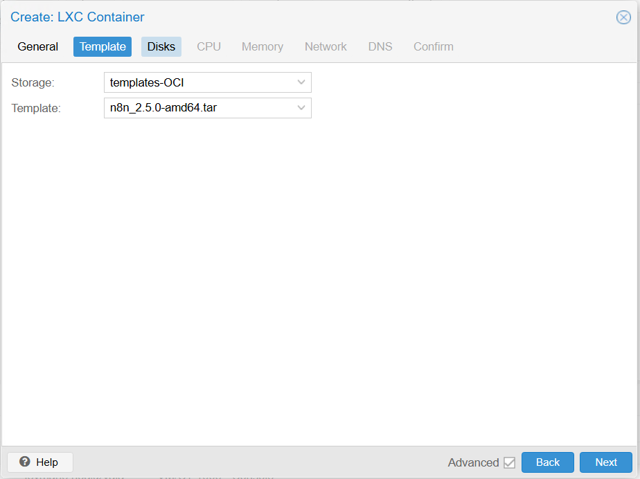 - Pour le choix du template, sélectionner comme stockage template-OCI puis le modèle n8n_2.5.0-amd64.tar :