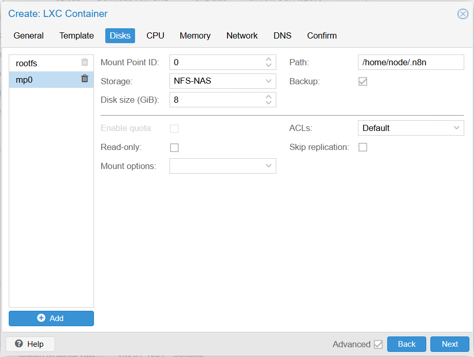 - Pour le disque, rajoutez un volume mp0 pour le mappage vers le dossier /home/node/.n8n du conteneur :